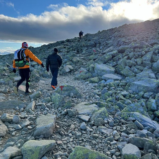 We met Michael , my second support crew at this final checkpoint , who was ready with our mandatory rucksacks . I changed shoes to trail shoes , put a hat , gloves and jacket on and we set off up the rocky path . Some of it was ok but it got increasingly technical as we ascended higher . I was getting colder and colder so ended up with 3 jackets on and in the last 2 km was described as bambi by my crew as my legs weren’t very co-operative . At this point in the race I was not concerned about placing just about making it to the top .